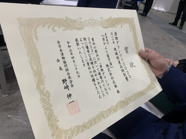 新着情報 NEWS 漬物グランプリ結果発表~~~(゜∀゜) 2023.05.02 皆さんおはようございます(´▽`*) いよいよ本日は 漬物グランプリの結果発表のお知らせ~(>_<) まずは会場内、人が沢山でビックリΣ( ̄□ ̄|||) 見えてきたのは受賞作品紹介の告知ボード! 目立つぅ~♪ 1番右上~~目立ぅ~笑 そして特設ステージでは最初に、「学生の部」「個人の部」の発表がされていました!! いよいよ法人の部の準備に取り掛かるのに説明や打ち合わせ等させていただきました_(._.)_ ドキドキです… いよいよ当社のPR時間。 頑張れ―――! 社長ーーーー! と思う余裕なく私は試食を来場者様関係者様へ配ってまして…( ノ ̫<。 ) 試食配る前に急いで激写。 各社PRタイム終了後は 農林水産省 大臣官房 新事業・食品産業部の 二井様からのご挨拶。 そしてーーー! いよいよ順位の発表でございます。 緊張感ある会場内.....。 ダラララララララーーー♪ ダン♪ な! 何と! 金賞で社名は呼ばれませんでした! と言う事は?残すは? 地域特産品特別賞→準グランプリ→グランプリ のどれかΣ(゜Д゜ υ) 凄っ.....! ドラムロールが緊張感が増します…。 果たして。 ダラララララララーーー ダラララララララーーー ドン♪ ..... .......... 地域特産品特別賞は..... 「株式会社北都さんです♪」 ワーーーーーーーー""(°͈ᗜ°͈ )Ξ( °͈ᗜ°͈)"" ワーーーーーーーーーーーー(*゜Q゜*) ありがとうございまーすm(_ _)m ありがとうございますm(_ _)m 本当にありがとうございます! 社長より今のお気持ちを一言いただき。撮影。 そしてそして、今年の栄えあるグランプリ授賞はと言うと、 紀州南高梅 夢葵 彩の舞㈱紀和農園プロダクツ(関西)さんでした! 試食させて頂きましたが とても彩りも味も素晴らしかったです( ⸝⸝⸝¯ ³¯⸝⸝⸝ ) 本当に本当におめでとうございます(((o(*゜▽゜*)o))) 最後は受賞者並びに全国漬物組合連合会長や総評、小説家、関係者で 記念撮影m(_ _)m 本当にこの度はありがとうございました。 また応援して下さった皆様、関係者の皆様ありがとうございましたm(_ _)m そして先輩方この度はおめでとうございましたm(_ _)m 私共もまたこのステージにこれるよう、そしてまた更なる上のグランプリ受賞できるように一層精進してまいりたいと思います( ・ㅂ・)و ̑̑ そしてそして、この模様は 本日5月2日の「ひるおび」で放送されますので そちらもご覧いただければとおもいます(*’ω’ノノ゛☆ 一覧に戻る
