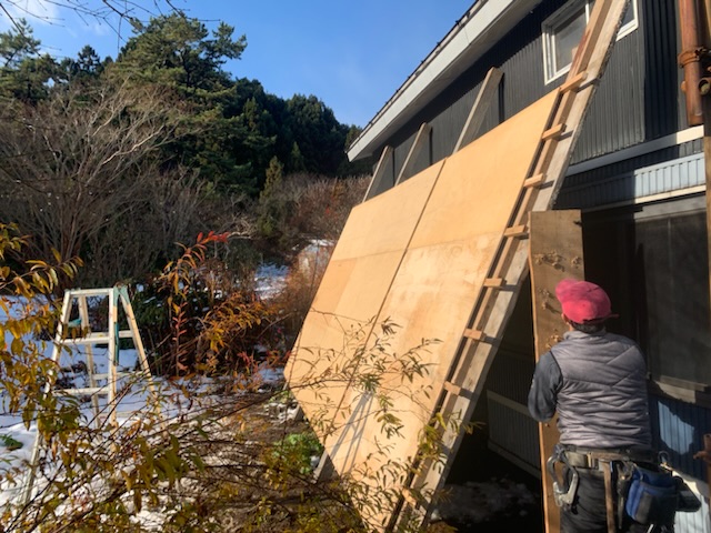 冬本番の雪囲いの作業をしている様子....