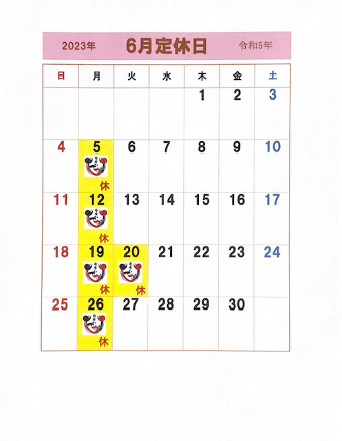 明日から6月ですので店休日のお知らせになります_(._.)_