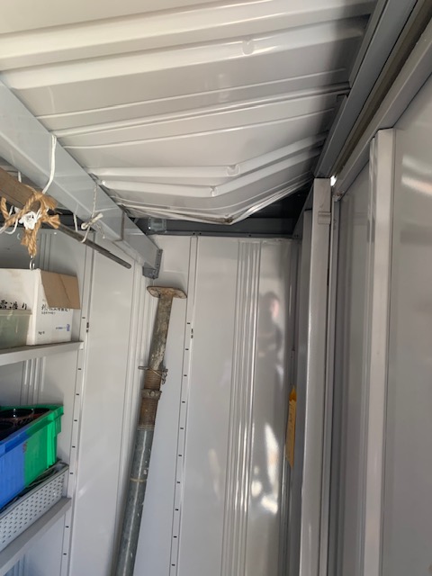 プレハブ小屋の屋根が雪により凹んでしまって