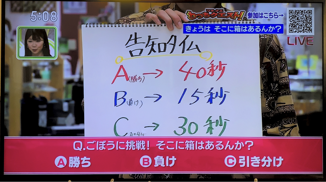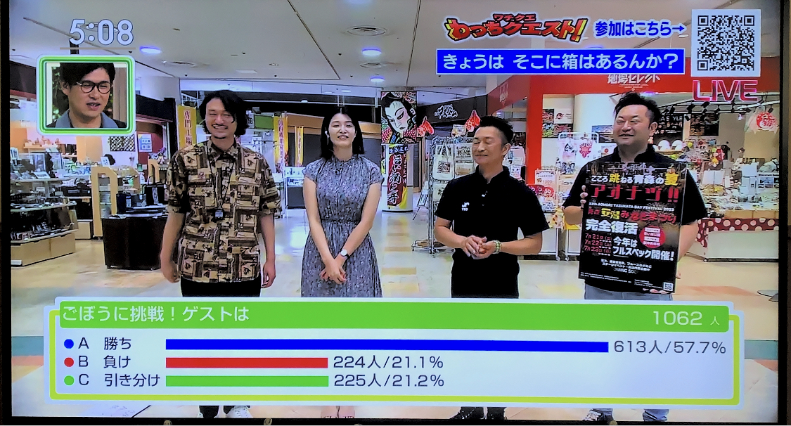 新着情報 NEWS わっちへ安潟みなとまつりの告知出演(^O^)/ 2023.07.04 皆さんこんにちは(^O^)/ 昨日のわっちはご覧になりましたでしょうか(*^。^*)?? 安潟みなとまつりの告知秒数を賭け 勝負をしに出演しに当社社長(左)会長と 千代谷副会長(右)行ってました(∩´∀`)∩ 私は画面越しで応援♪ 視聴者予想では会長が勝つという予想が 大半!! そして何の勝負をするかと言うと、小さい箱にお手玉を 5個中、何個入れられるか? 3玉と2玉の2回に分けて投げるそうです!! まずは芸人の「ごぼうさん」の挑戦!! 結果は3玉のうち2玉も入りましたΣ(・ω・ノ)ノ! 続いて会長… はい。3玉のうち1玉入りました…(笑) そしてラスト、ごぼうさんのチャレンジ!! なんと!!もう1玉入り全部で3玉入りました!! さーーー!! 後がない会長♪ はい…。 床に落ちてるお手玉が物語っております(笑) 5玉のうち2玉で惨敗でした(;´Д`) はい。きっと本番は弱いんです(笑) しかし告知はしっかりさせて頂きました(`・ω・´)ゞ 皆様からの安潟みなとまつりへのご協賛や 当日のご利用、お待ちしておりまーーーーす(≧◇≦) 一覧に戻る