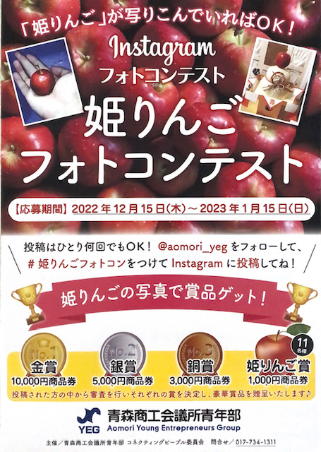 新着情報 NEWS 姫りんごフォトコンテスト~(。◕ˇдˇ◕。)/ 2022.12.29 皆さんこんにちは('ω')ノ 当社社長が 来年度より青森商工会議所青年部の 会長になる その青年部よりお知らせ_(._.)_ 「姫りんごフォトコンテスト」!! もうご応募はすでに始まっていますが 写真内に姫りんごが写り込んでいればOK♪ #姫りんごフォトコンをつけてInstagramに投稿!! 「投稿はひとり何回でもOK!」だそうです。 是非沢山投稿して 商品券をゲットしましょう(*´ω`*) 応募期間は2022年12月15日(木)~2023年1月15日(日) までとなっております(`・ω・´)ゞ 一覧に戻る