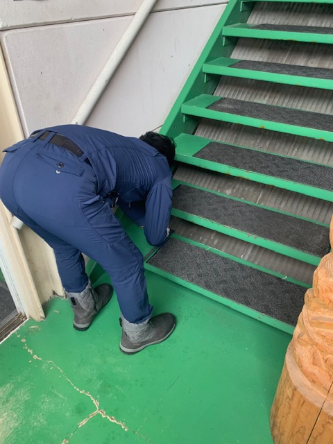 新着情報 NEWS 念願の.......(●´ω`●) 2023.01.24 皆さんこんにちは(゜∀゜) この寒い中、1階の倉庫が騒がしい様子..... 何やらずっと社長がやりたかったことらしいのですが この雪降る季節や、雨が降っていたりした時に 階段が濡れて転んだりすればダメだなー(;´Д`) という心配がずっとあったらしく 本社入口の階段に 転ばないように滑り止めのマットを設置させて頂きました!! …… ………… そして長らくお待たせしました!!!!!!!!!!!!! 社長のおしりファンの方いましたら、 久しぶりの必見ショットです(笑)!!!!!!!!!!!!!!!!!!! そんな写真を撮ってるとも知らずに 真剣に印をつける社長……(笑) 見事に私綺麗にマットを設置したつもりでしたが 実はピッタリ階段に合わせるのではなく 2ミリ程ズラして欲しかったらいです。( ̄▽ ̄;) やり直しをする社長(笑) お分かりいただけますでしょうか!?(`・ω・´) この2ミリが大事なんだそうです!! 少し歩いてズレてもいいように後先の事もしっかり考えてる社長♪ そして無事に終了し…… これで安心して上り下りできる階段となりました! 一覧に戻る